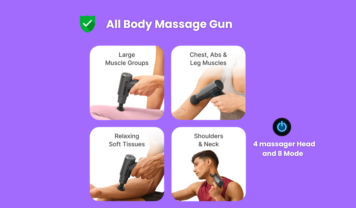 My back and legs used to hurt after workouts, but with this massage gun the pain eases in a few minutes. The noise is low and the different heads are really useful. I use it 10–15 minutes a day